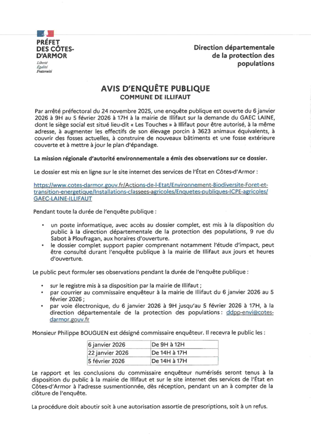 Une enquête publique sera ouverte du 6 janvier 2026 au 5 février 2026 à la mairie d'Illifaut sur demande du GAEC LAINE pour être autorisé à augmenter les effectifs de son élevage porcin, couvrir des fosses actuelles, construire de nouveaux bâtiments et une fosse extérieure couverte.
