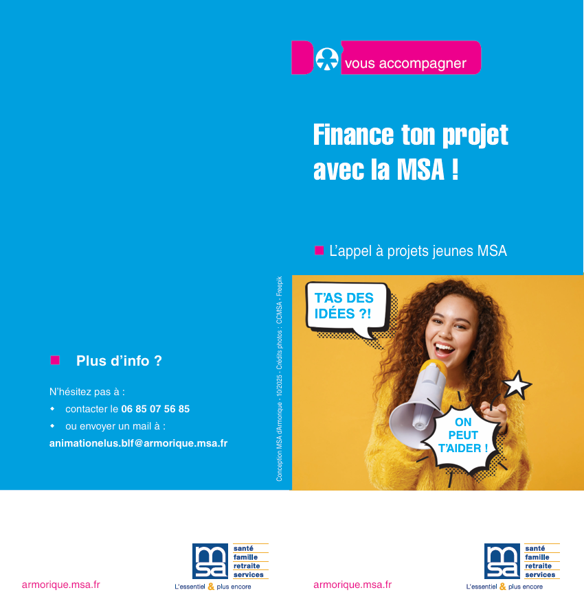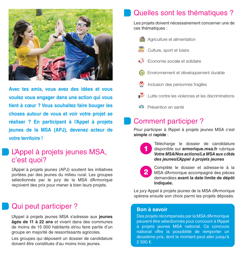 Comme chaque année, la MSA d’Armorique organise le concours « Appel à Projets Jeunes : Mieux vivre en milieu rural » visant à soutenir les projets collectifs des jeunes de 11 à 22 ans. (Sur les communes de moins de 15 000 habitants, il n'est pas nécessaire d'être ressortissant de la MSA pour participer.)