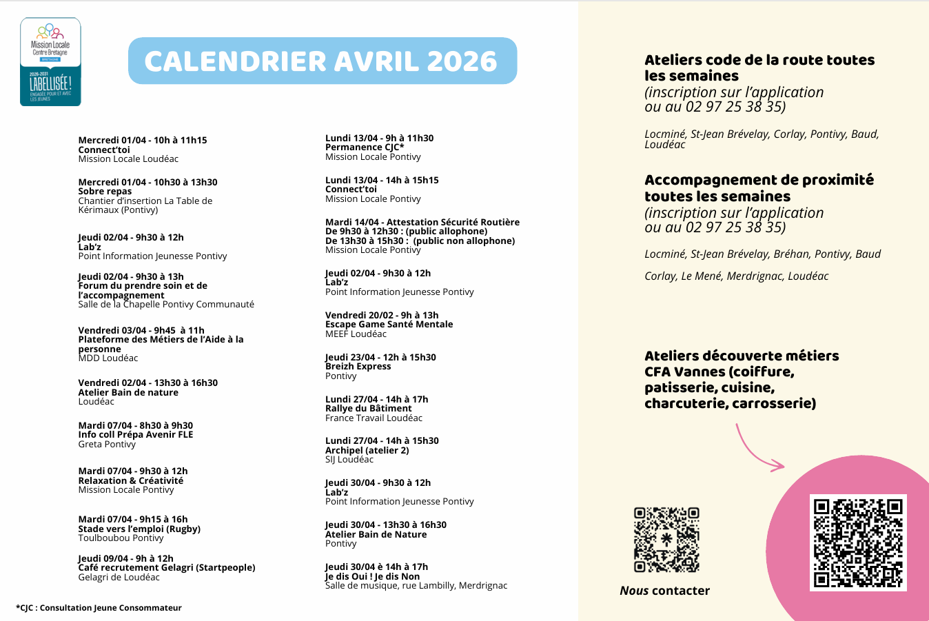 Vous trouverez le calendrier des événements organisés par la Mission Locale Centre Bretagne pour ce mois d'avril.
