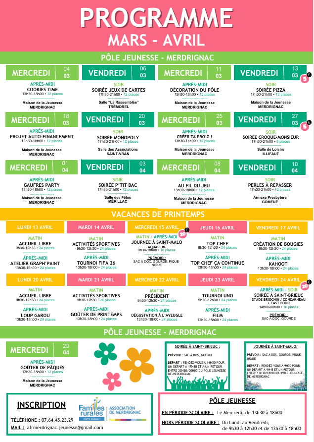 Voici le programme du Carré Jeunes de Merdrignac pour le mois de mars et d'avril !