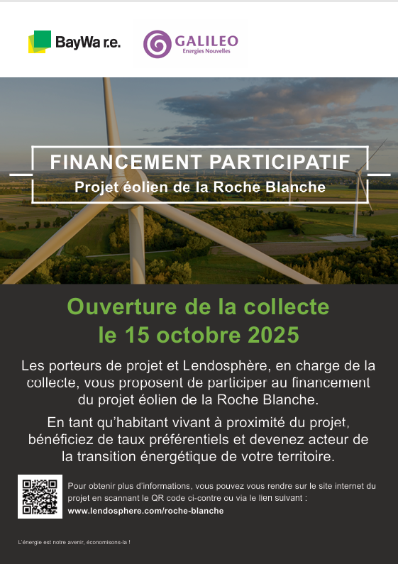 Le financement participatif du projet éolien de la Roche Blanche est officiellement ouvert. Dans le cadre de cette collecte et en tant qu'habitant vivant à proximité du projet, les porteurs de projets vous proposent de bénéficier d'un taux préférentiel pour tout investissement.
